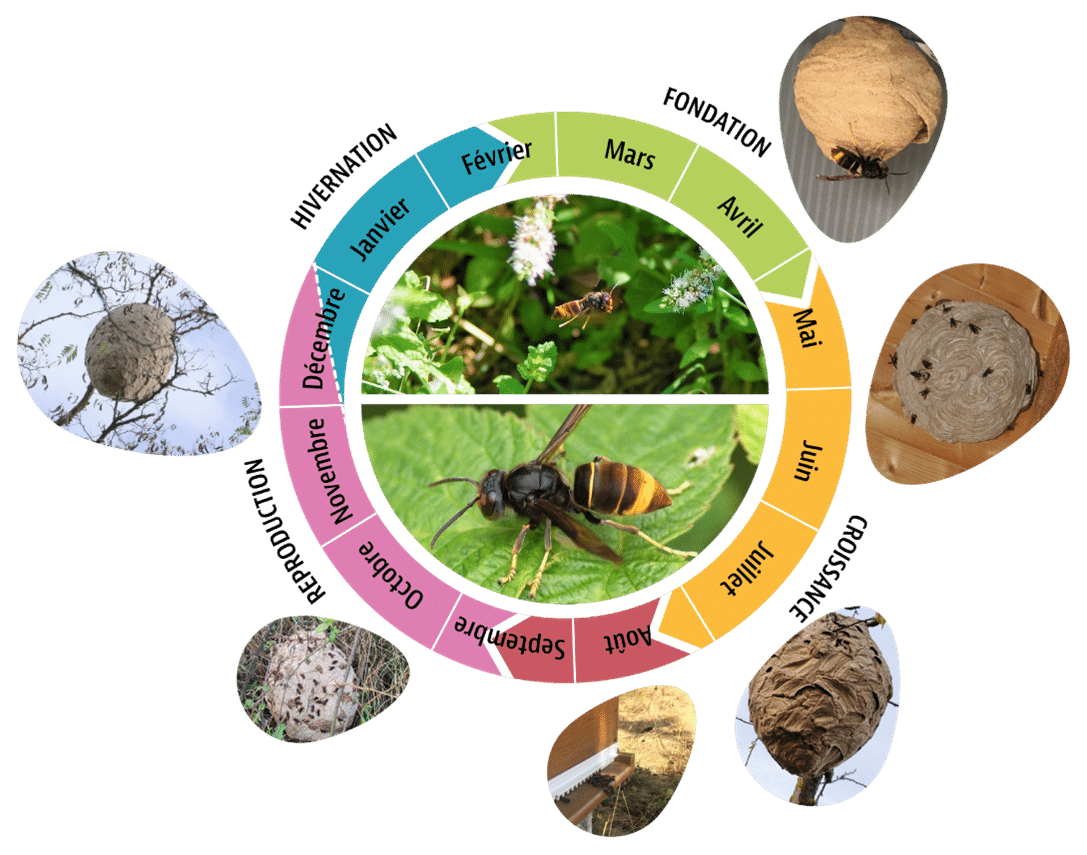 Le frelon asiatique est aujourd’hui présent sur toute la région Auvergne-Rhone-Alpes. Son cycle biologique comprend un certain nombre d’étapes qui permettent de comprendre la dynamique annuelle de la population.